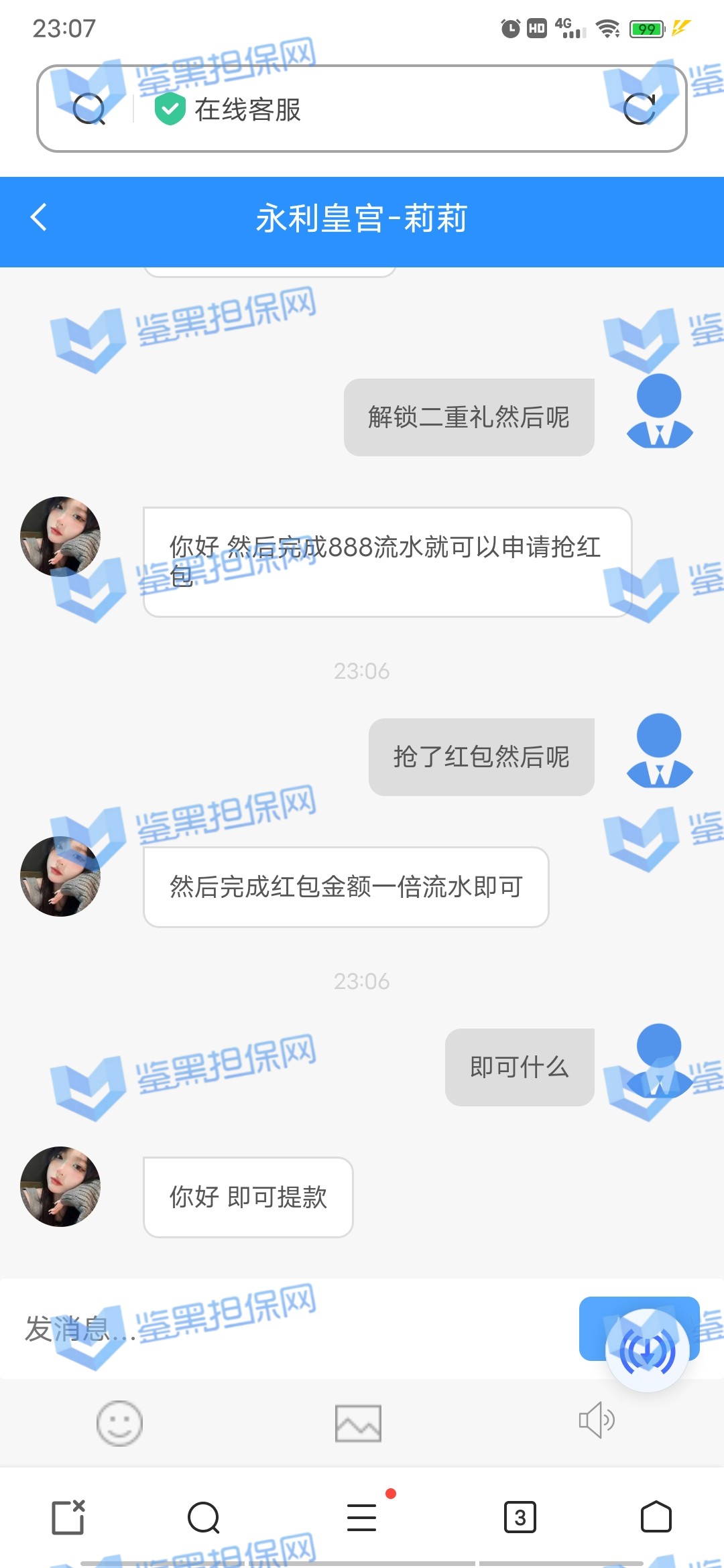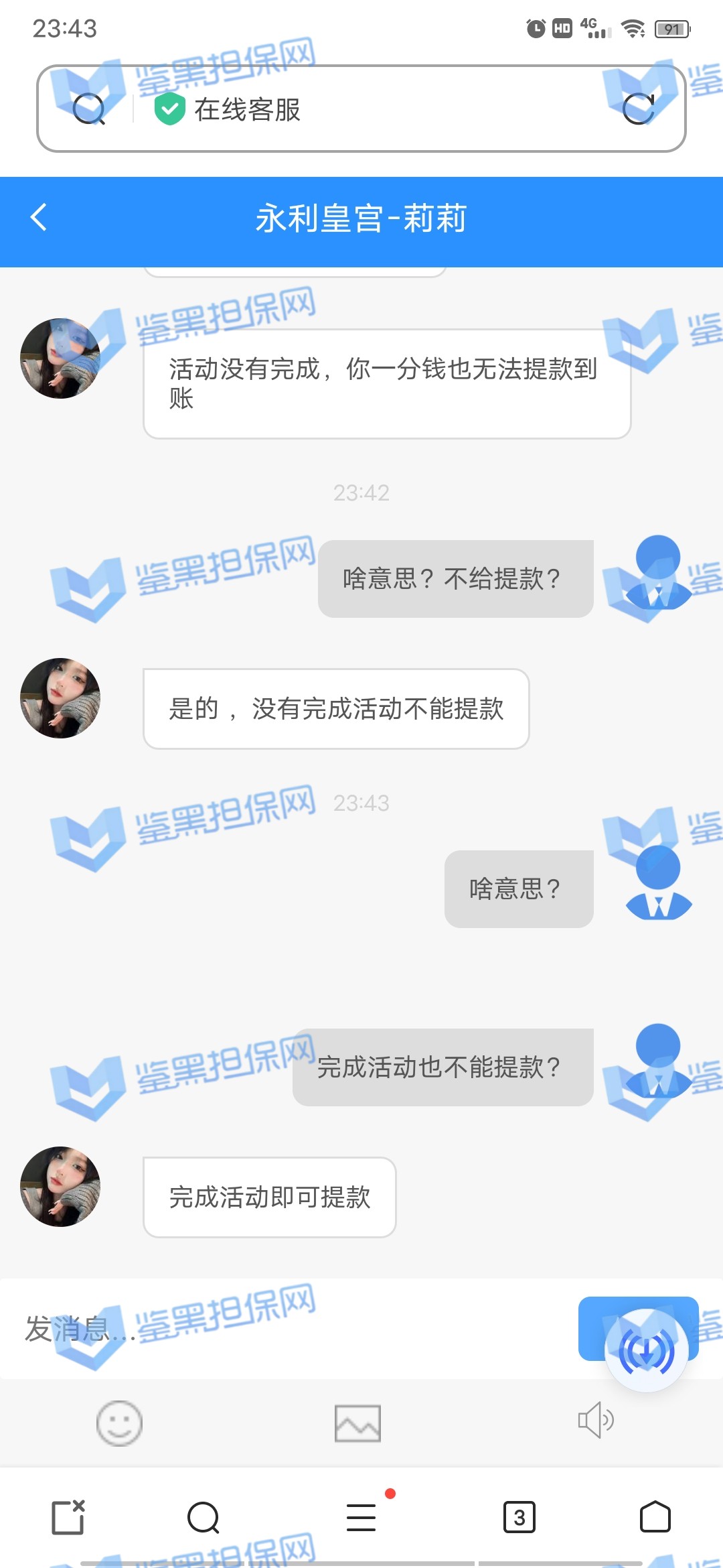 3.用户提交维权申请后资料不齐全,需在一周内补齐鉴黑担保网客服要求的资料,若超过一周时间没有完善维权信息,维权将因资料不全拒绝受理;