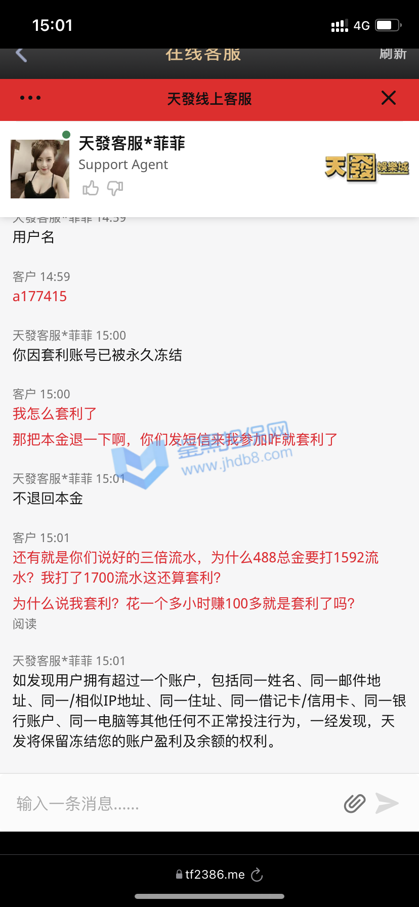 我是2021年8月10日注册的,到8月15日是第5天了,今天15:05分存款了15000元,玩彩票极速11选5,玩了一会,盈利了1240元,本着见好久收,然后就选择提款了,提款时间是15:20分,结果一直是审核中,过了有1个小时吧,提款失败了。于是便去问客服,客服说由于目前国际网络波动导致系统出款失败,请我重新提交提款,于是我便看了钱包,余额变0了,锁定钱包是16240元,于是便又问客服,客服又说系统大数据检测到了存在违规投注异常行为,违反了娱乐规则,将会冻结账号,无法再次登录娱乐。于是我便和客服说,不存在非法投注的情况啊,我昨天前天大前天都是这么玩的啊。于是客服说正在为我提交本金,然后让我进行提款,然后我又返回钱包看,余额还是0元,锁定钱包变成了1240元,等于我15000的本金存粹没有了。便又问客服去了,客服说系统自动例行检测我存在违规行为,且情节较为严重,已经扣除红利,并冻结账号,无法登录娱乐。然后说由于各部门分工不同,在线客服无法干涉到其他部门的工作程序,客服仅负责告知。然后我又问客服,客服翻来覆去就是那么几句话,说我非法投注,违规投注,违规获利,严重违反平台游戏规则损害平台利益,按照平台规则给予相关处理,以客服告知我的结果为准。反正就是不给出款,盈利不给,本金也不给。我多次和客服说,没有违规啥的,也不理,最后干脆对我爱理不理了。