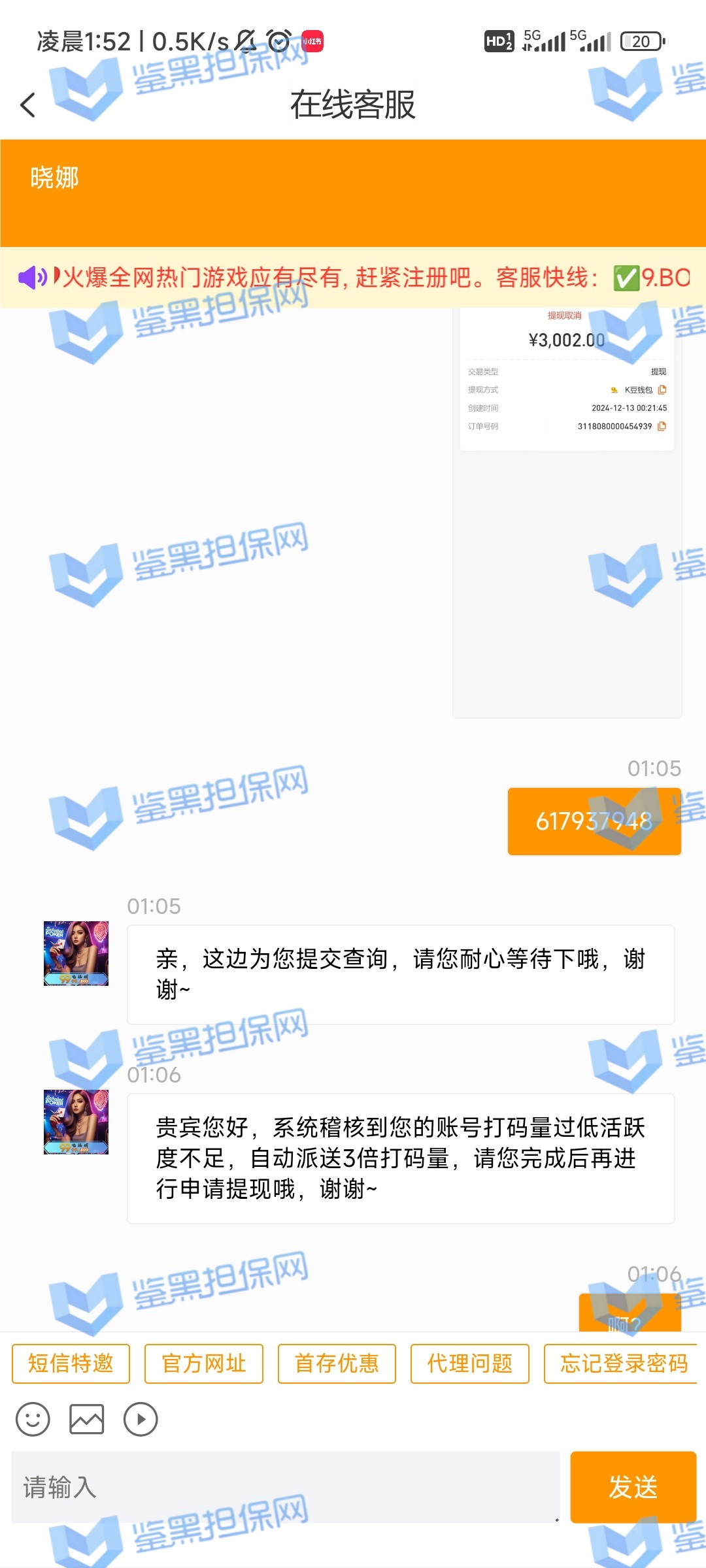 2、此会员提交提款3000后,被告知活跃打码量低,需要进行3倍流水后才可以提款,当重新完成3倍打码量后再次被告知风控检测异常,需要充值1500激活严重后才可以提款。