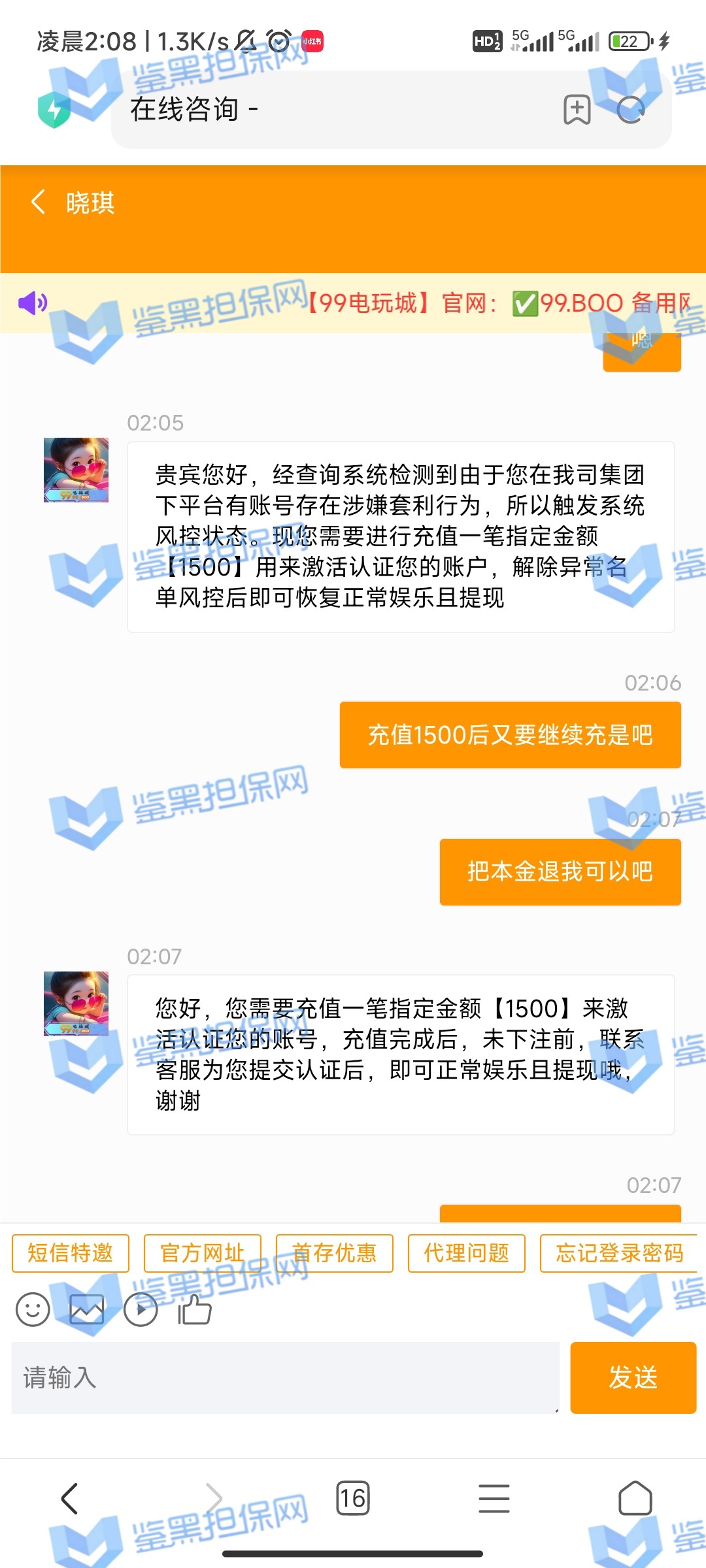 3、由于再次提款被要求再次存款验证之后,鉴黑维权专员联系该平台相关负责人多次交涉,对方态度明确必须充值指定1500进行认证,原因是因为在集团下平台有账号存在套利行为,必须解除风控后才可以提款,关于这个说辞也没有实际证据提供加持,存在套娃行为,这种行为乃杀猪盘的惯用阴谋。